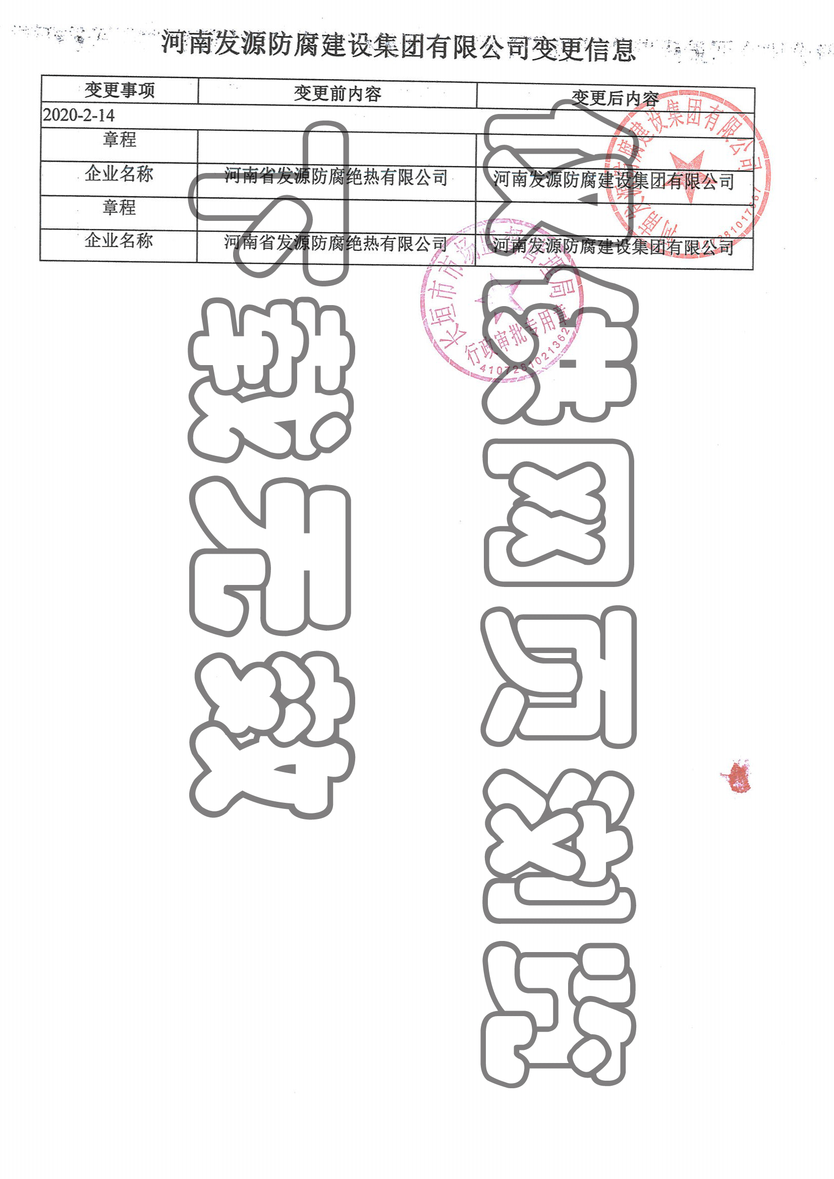 由于公司業(yè)務(wù)發(fā)展需要,從2020年2月14日起,將原公司“河南省發(fā)源防腐絕熱有限公司”變更登記為“河南發(fā)源防腐建設(shè)集團(tuán)有限公司”。即日起,公司所有對(duì)內(nèi)及對(duì)外文件、資料、開具發(fā)票、賬號(hào)、稅號(hào)等全部使用新公司名稱。公司更名后,業(yè)務(wù)主體和法律關(guān)系不變,原簽訂的合同繼續(xù)有效。謝謝合作。